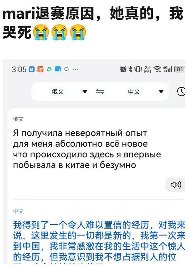 可是,有网友回看节目时,用翻译软件发现了俄罗斯姐姐退赛的的确原因,因为她其时的原话中提到“我坚定到我不想占据别东谈主的位置”,但节目组并莫得通过字幕翻译这一句。 俄罗斯姐姐的退赛解说并不长,但“不想占据别东谈主的位置”照旧能评释一切了,她看成一个出谈了十年的熟练唱跳歌手,当她知谈《浪姐5》并不是一个高水平的竞技节目,而况不少姐姐都是零唱跳警告后,依然已然选拔退出,给其他姐姐更多契机皇冠2500走地,实在不懂节目组为何不完好意思翻译她的原话。